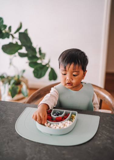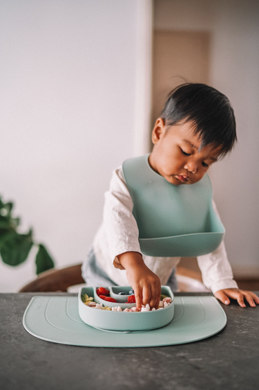 Our silicone catch-all bibs are adjustable for kids 6 months to 3 years, and are made of 100% food grade silicone that is BPA and phthalate free. Easy to clean with soap and water, our placemats and bibs are non-stick, waterproof and stain resistant. Our placemats and bibs are also dishwasher safe.